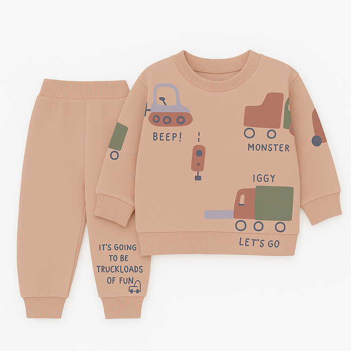 Το σετ περιλαμβάνει μπεζ φούτερ με πολύχρωμα σχέδια από φορτηγά και μηχανήματα, καθώς και παντελόνι με τύπωμα που ολοκληρώνει το look.