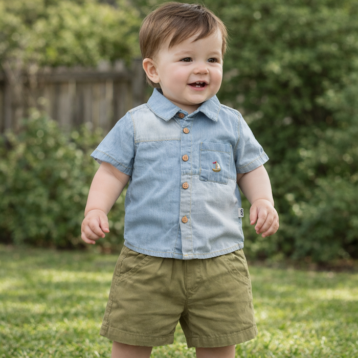 Τζην πουκαμισάκι και βαμβακερή βερμούδα σε όμορφα χρώματα.