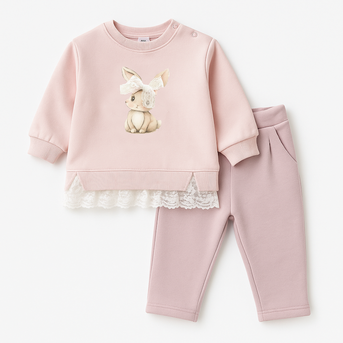 Αποτελείται από άνετο μπεζ παντελόνι και φούτερ με χαριτωμένο σχέδιο- λαγουδάκι και δαντέλα στο τελείωμα της μπλούζας.