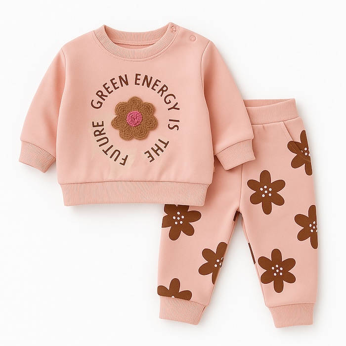 Αποτελείται από ζεστό φούτερ και άνετο παντελόνι, σε γλυκό ροζ χρώμα με παιχνιδιάρικα λουλουδάκια σε γήινους τόνους.